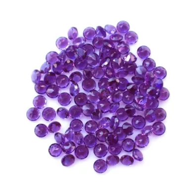 Produit : Améthyste naturelle, Forme : Ronde, Couleur : Violet, Taille : 4,90 - 6,10 mm, Poids : 0,45 - 0,85 carats, Clarté : Aucune inclusion visible, Traitement : Non traité, Origine : Zambie